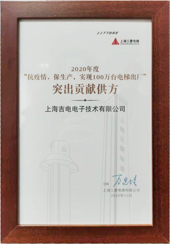 2020年轉(zhuǎn)瞬即逝,突如其來(lái)的疫情并沒(méi)有打亂我們發(fā)展的節(jié)奏,在12月25日那天,得益于全體員工的不懈努力,上海吉電電子技術(shù)有限公司憑借優(yōu)質(zhì)的服務(wù),在疫情期間對(duì)上海三菱電梯的鼎力支持,我司不負(fù)眾望,榮獲2020年度上海三菱電梯“抗疫情、保生產(chǎn)、實(shí)現(xiàn)100萬(wàn)臺(tái)電梯出廠(chǎng)”——“突出貢獻(xiàn)供方”獎(jiǎng)。此時(shí),唯有歡笑與感動(dòng)才能慰藉我們一年的努力和奮斗。